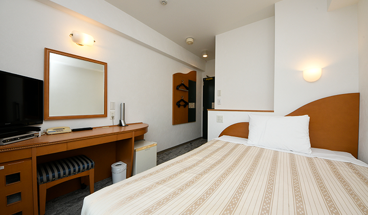 コンパクトなお部屋の作りですが、お二人でもゆったりとくつろげるダブルベッドと開放感バツグンのバルコニー付き